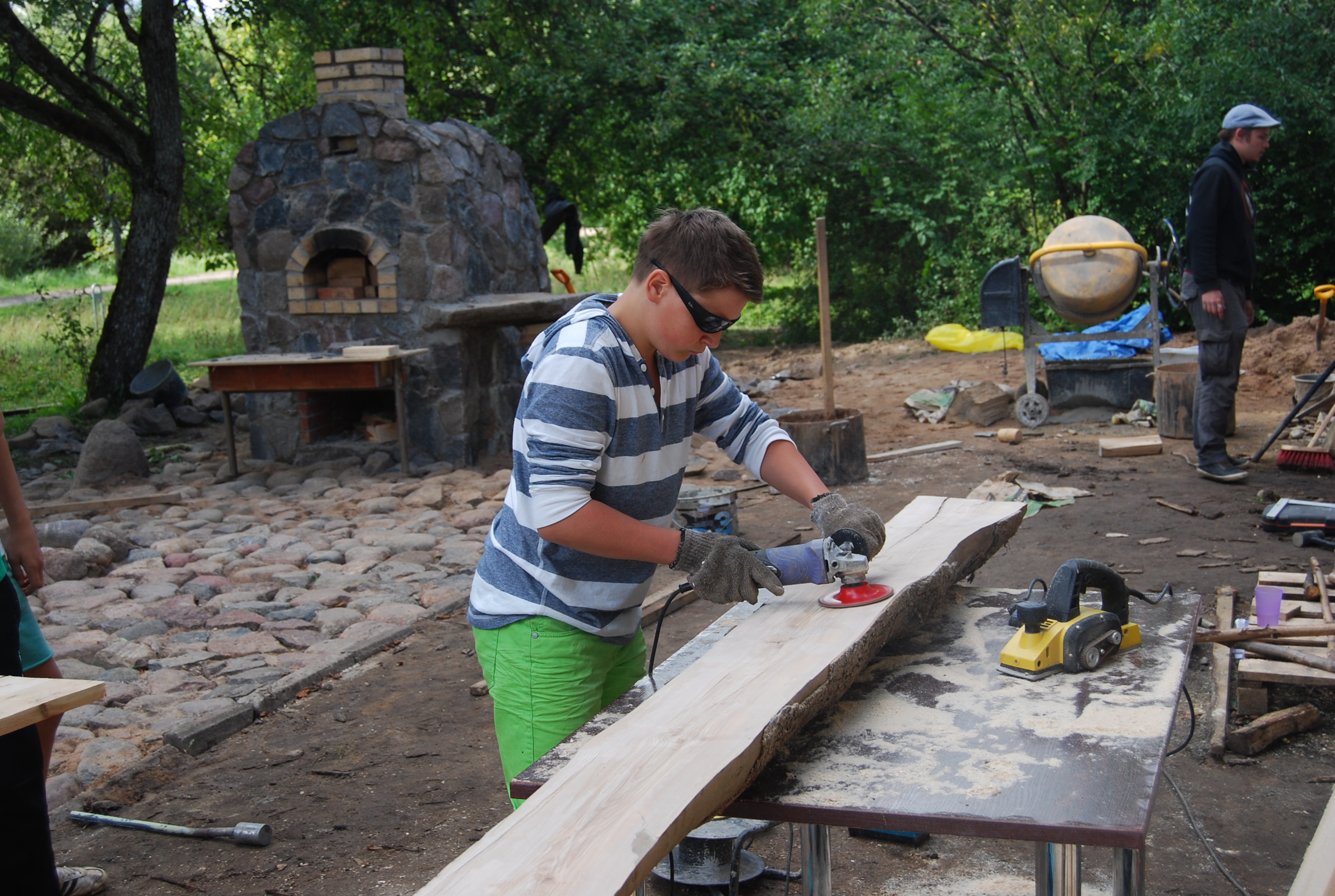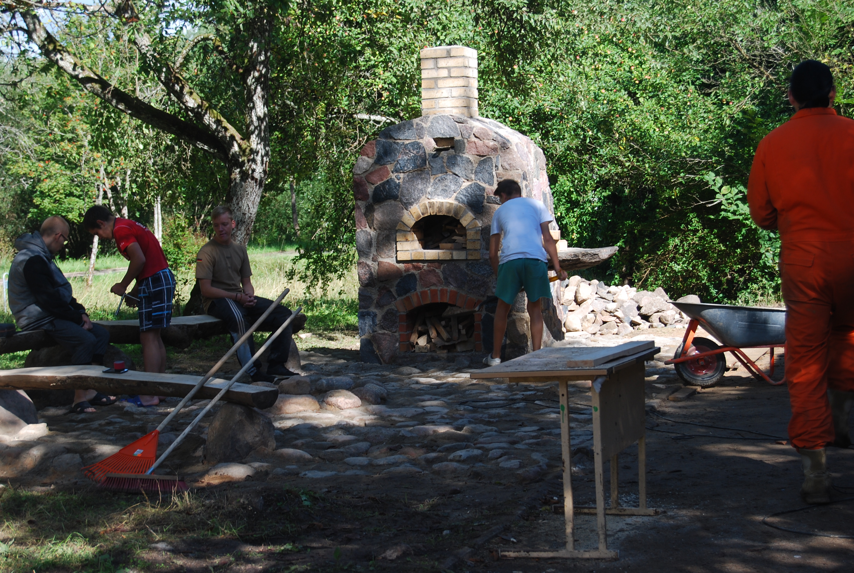 Die Bau-Gruppe hat es geschafft, den Ofen fertigzustellen, und wir haben darin unsere erste selbst-gebackene Pizza zubereitet. Sie war vorzüglich! :)) Jetzt arbeiten sie hart daran, die Bänke und den Platz um den Ofen herum fertigzustellen.