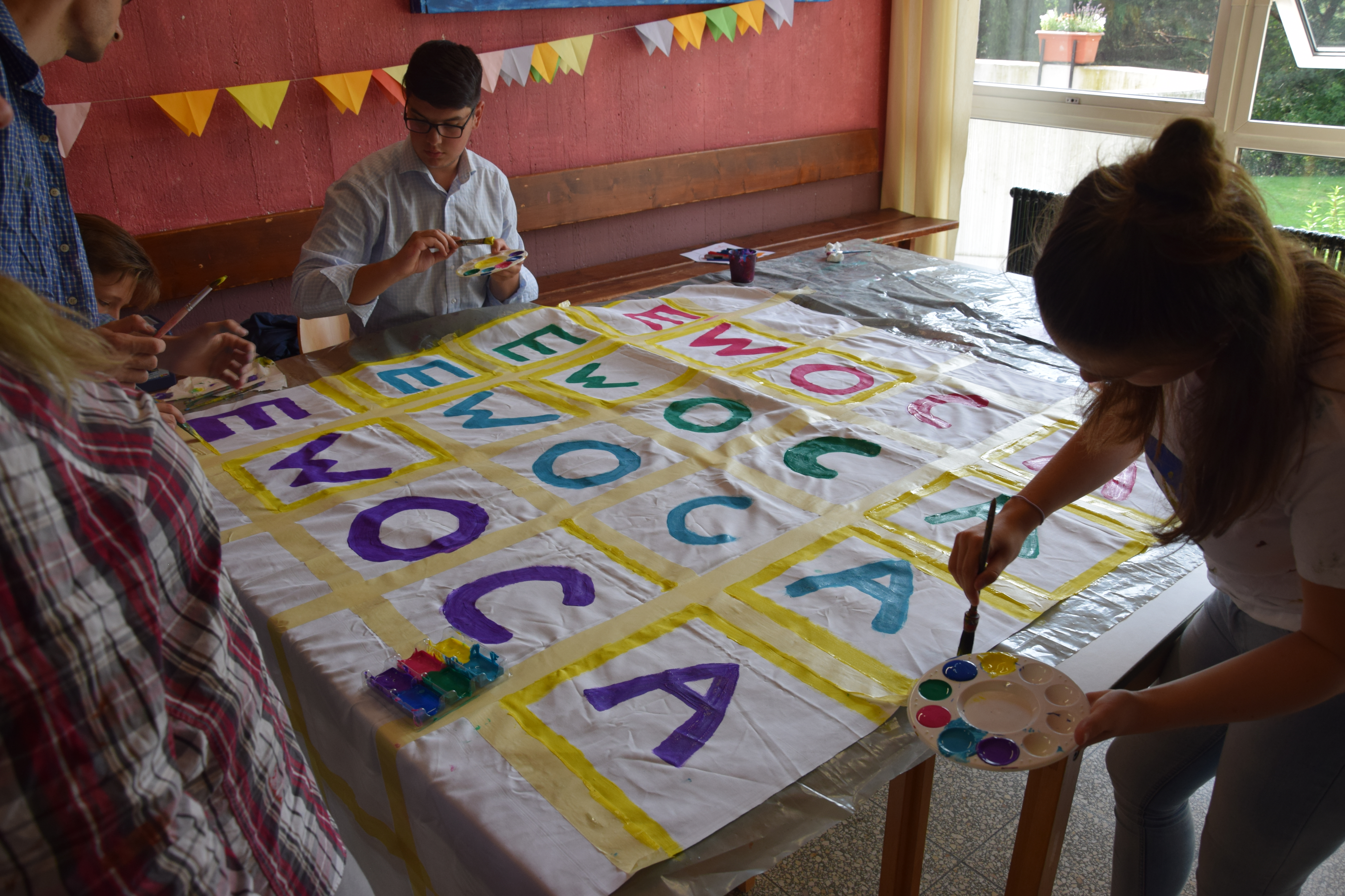 Der ganze Montag war verschiedenen Workshops gewidmet, in denen es um Vielfalt, Kochen, und kreatives Upcycling ging. Die Jugendlichen wurden in zwei kleinere Gruppen aufgeteilt, und, als Ergebnis hat eine der Gruppen ein schmackhaftes Abendessen gekocht, während die andere Gruppe ein altes Bettlaken zu einem Twister-Spiel umfunktioniert hat, dass wir nun Abends zusammen spielen können.