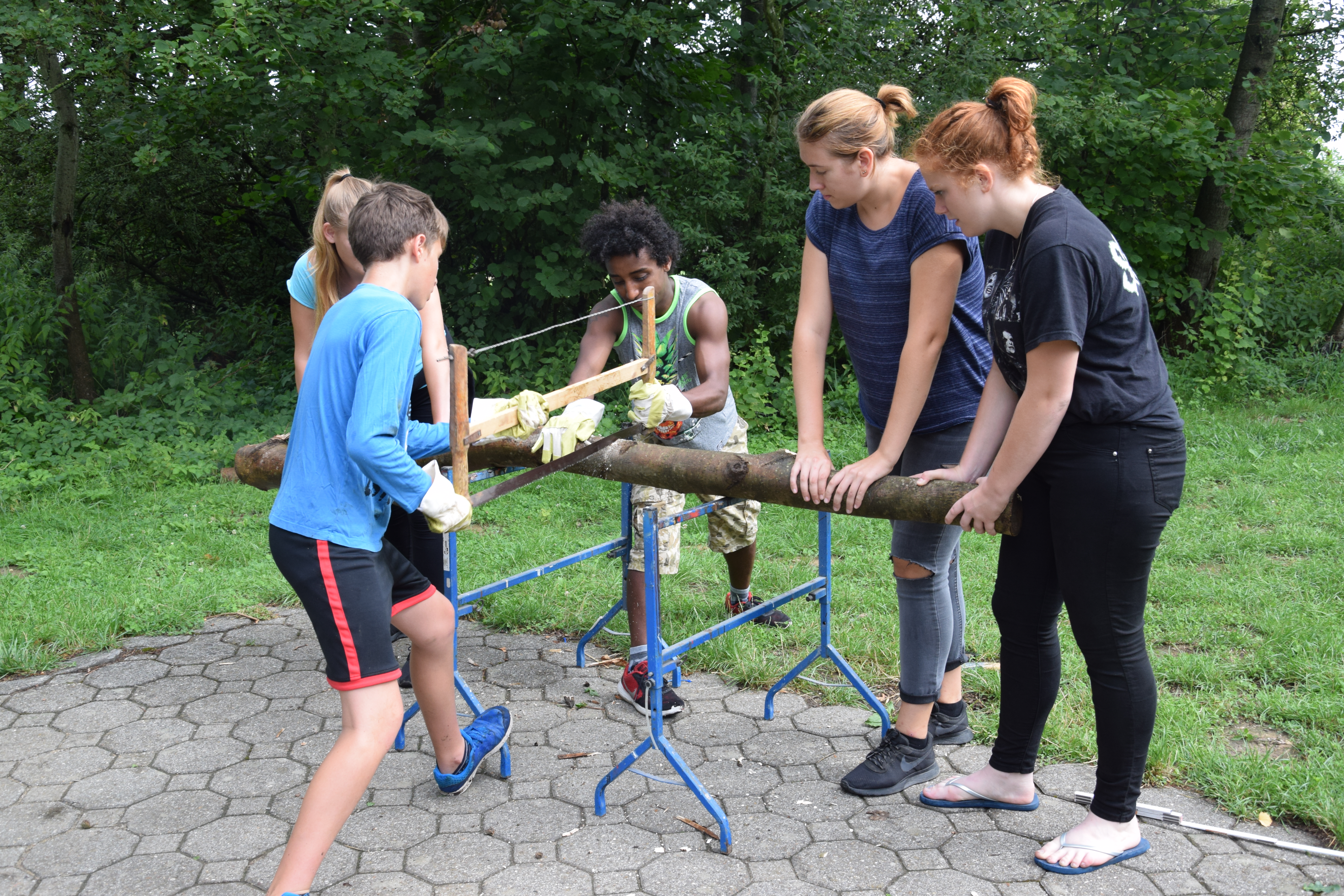 Je weiter wir in der Realisierung des Pfades voranschreiten, desto mehr interessieren sich die Jugendlichen dafür: Donnerstag war ganz der Gartenarbeit gewidmet, und die Form des Pfades wurde vorbereitet. Zuerst hat die ganze Gruppe Bäume aus der Umgebung genommen um die Kanten festzulegen. Erst dann konnten wir beginnen diese in kleinere Stücke zu schneiden um an den Seiten eine Begrenzung zu bauen.